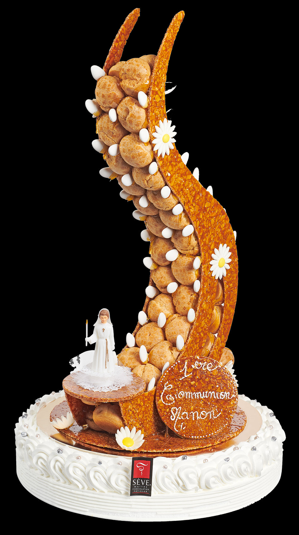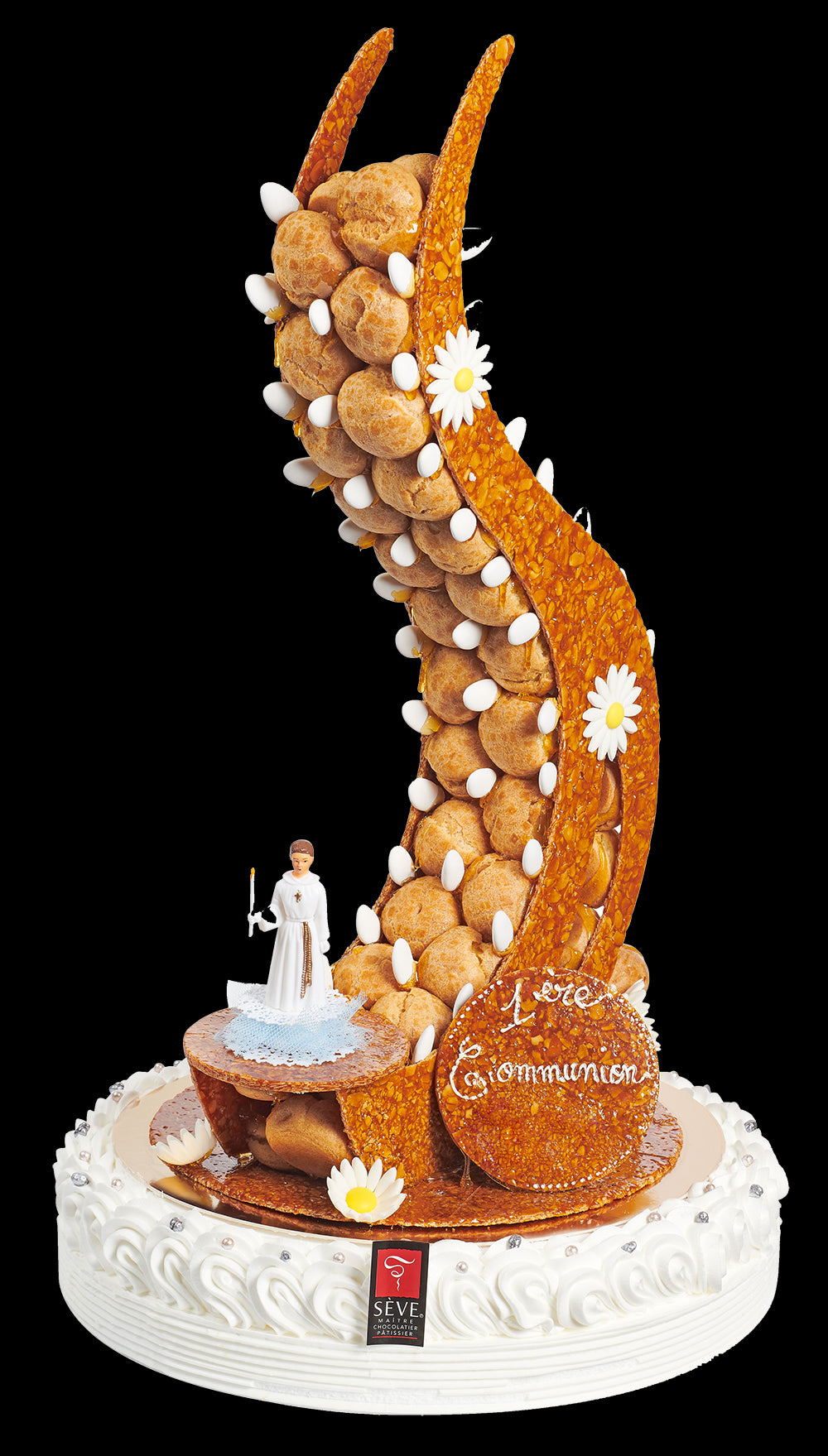 Composition de choux, nougatine et dragées sur un socle en glace royale. Le décor est fait de fleurs en pastillage (sucre).